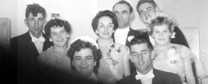 L-R - Bert Samson, Julie (Marchand) Cordeau, Bernadette, Muriel (Marchand) Martell, Danny Jeffrey, Willard Jeffrey, Norman Jeffrey and Yvonne (Boudreau) Samson